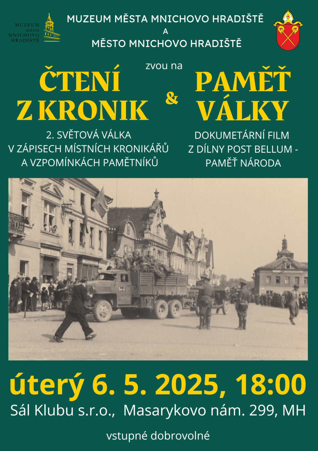 Už 6. května se můžete od 18 hodin zaposlouchat na sále Klubu do předčítání z městských kronik a vzpomínek pamětníků. Vybrané texty připomenou okupaci, protektorátní léta i osvobození, kterému na Masarykově náměstí předcházela střelba do davu. Následovat bude středometrážní film z dílny Post Bellum. Vstupné dobrovolné.