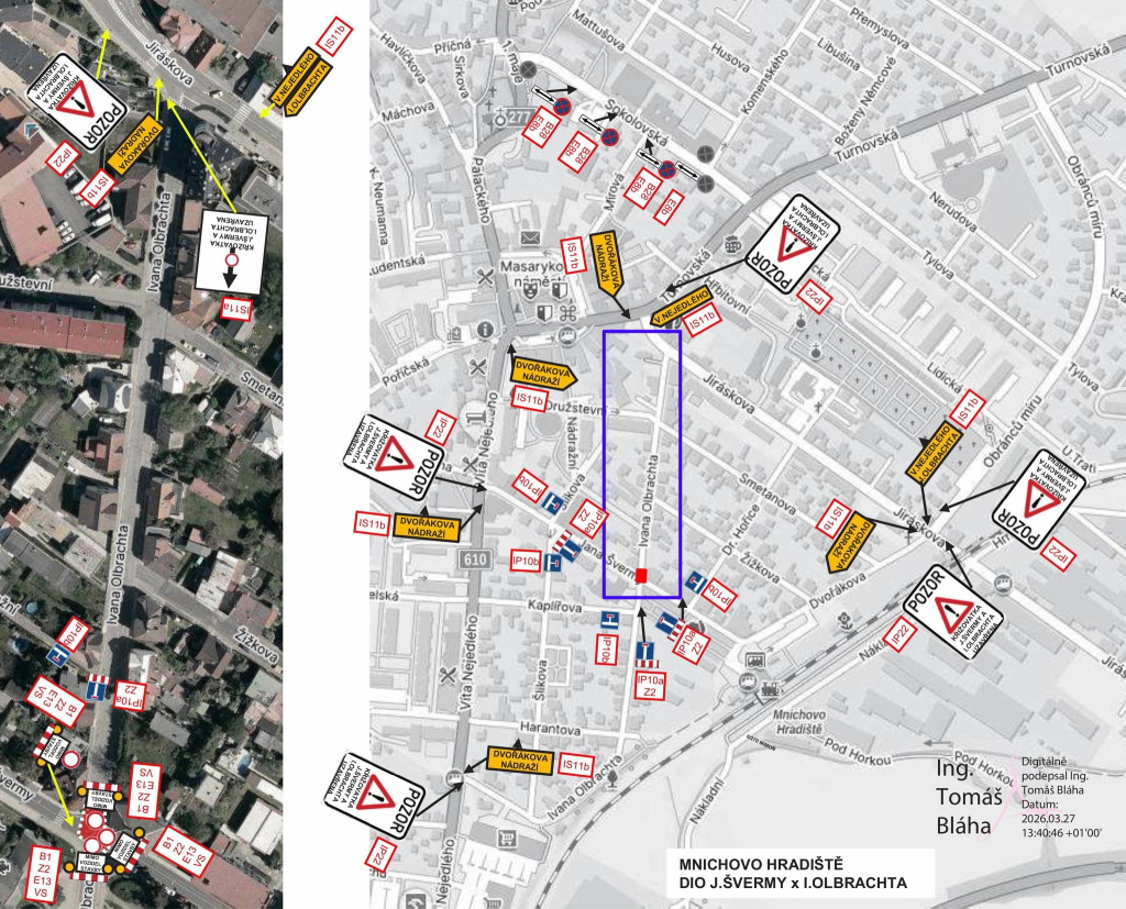 Hned druhý den, ve středu 15. dubna, se kvůli výměně vodovodního a kanalizačního potrubí uzavře křižovatka ulic Jana Švermy a Ivana Olbrachta u kina. Toto omezení potrvá do 1. května. Uzavírka se dotkne i autobusových linek 716, 171 a 733, a to již od 13. dubna, kdy měla uzavírka původně začít. Odjezdy a příjezdy jednotlivých linek se budou od běžného provozu lišit až o pět minut, na lince 716 bude dočasně zrušena zastávka Mnichovo Hradiště, Dukelská. Od 1. května bude opět platit běžný provoz.