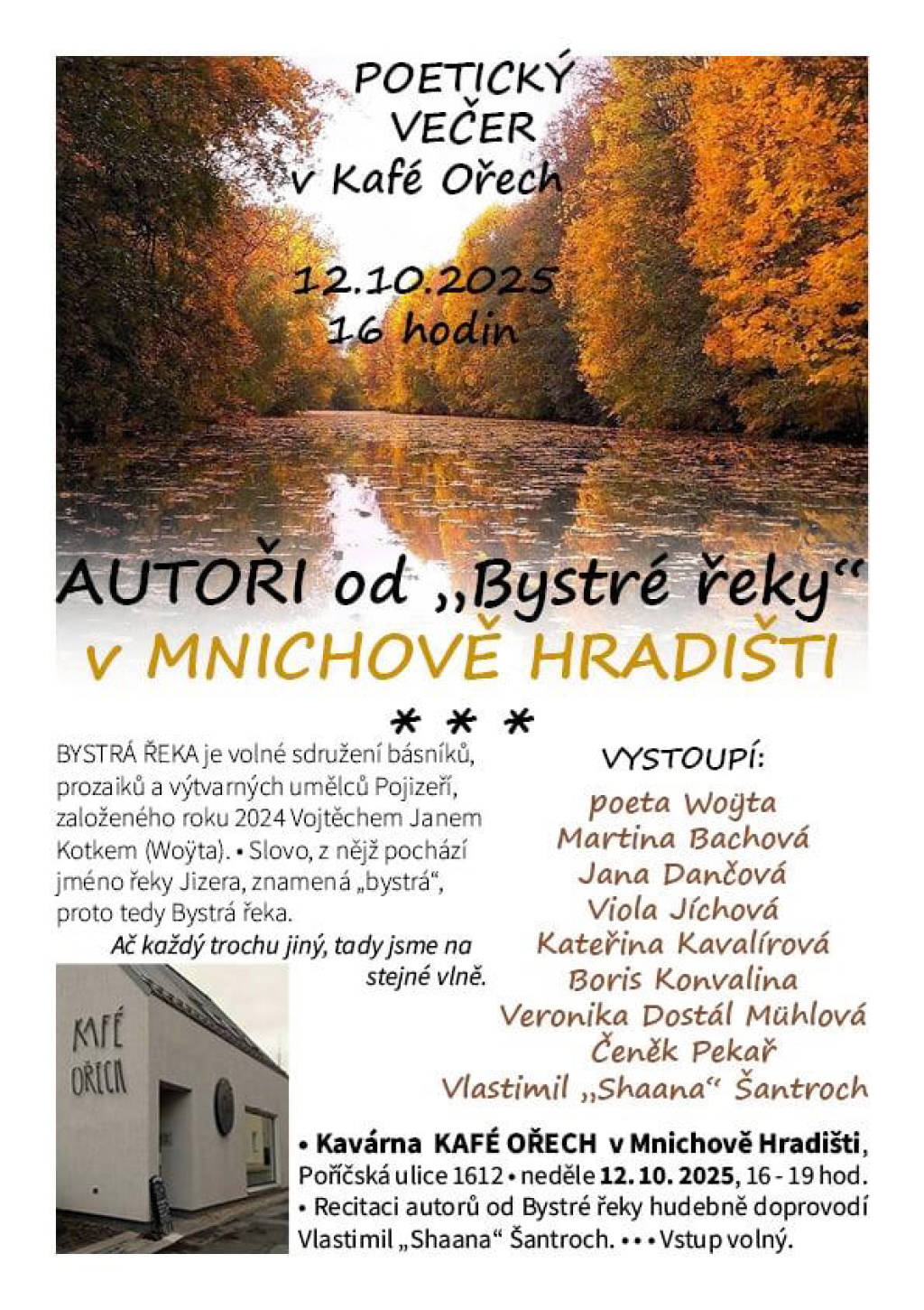 V neděli 12. října od 16 hodin se v kavárně Kafé Ořech v Mnichově Hradišti uskuteční poetický podvečer, na který dorazí autoři sdružení Bystrá řeka.