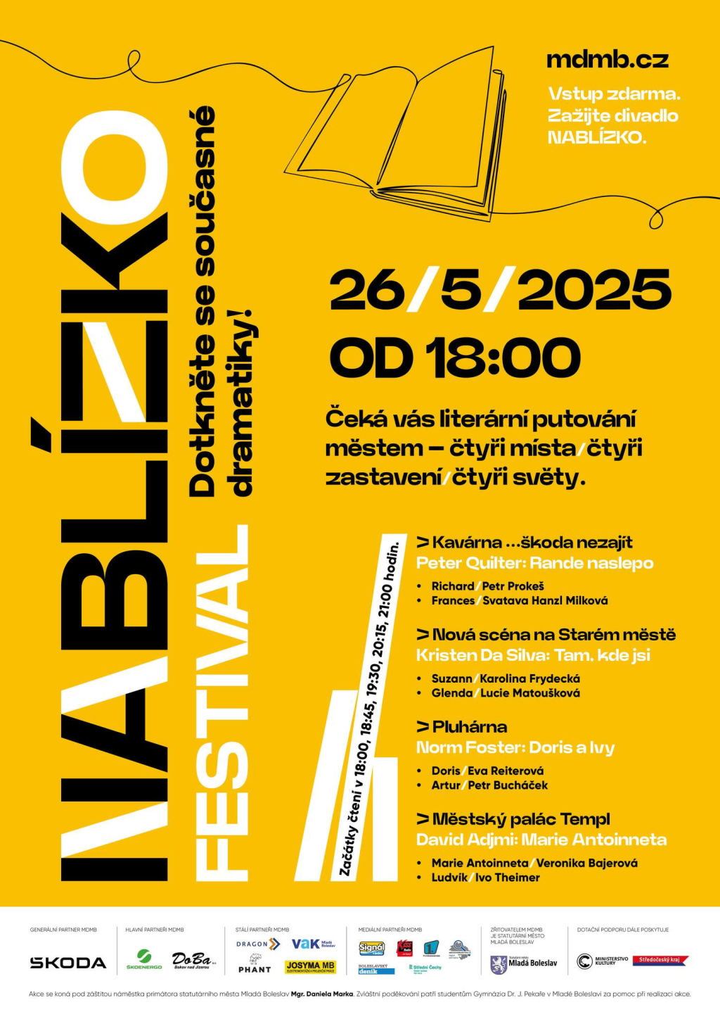 V pondělí 26. května se koná první – pilotní ročník nového festivalu NABLÍZKO, který je kombinací dvou oblíbených kulturně komunitních akcí pořádaných Městským divadlem Mladá Boleslav: Noci literatury a festivalu Nadosah.
