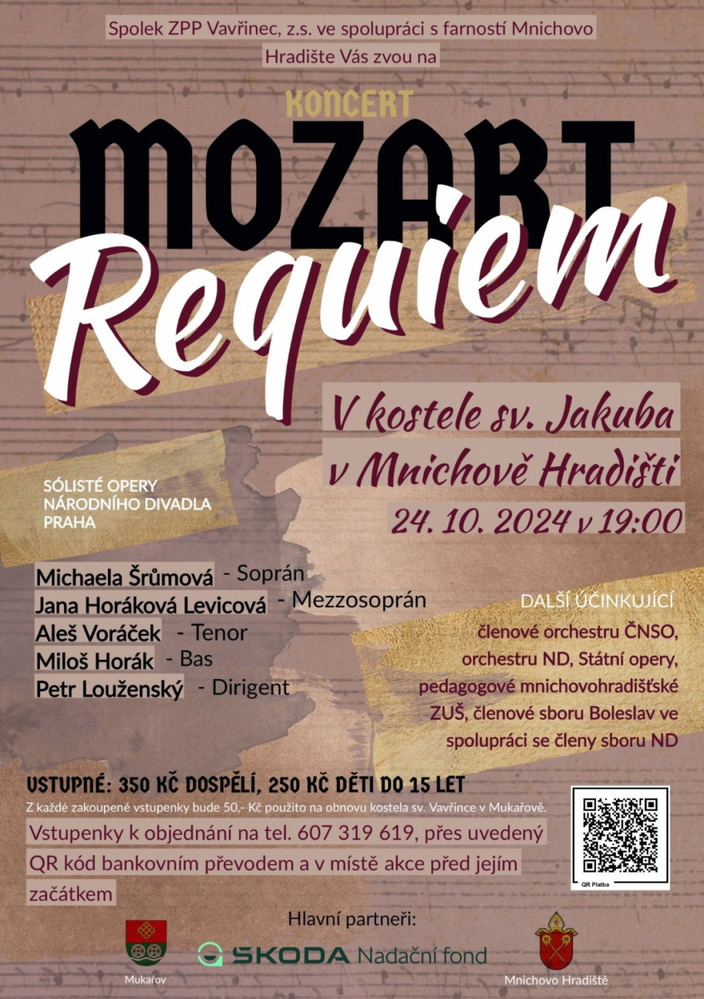 Spolek ZPP Vavřinec ve spolupráci s farností Mnichovo Hradiště zve všechny milovníky vážné hudby na koncert Mozart Requiem, který se uskuteční v kostele sv. Jakuba v Mnichově Hradišti ve čtvrtek 24. října od 19 hodin.