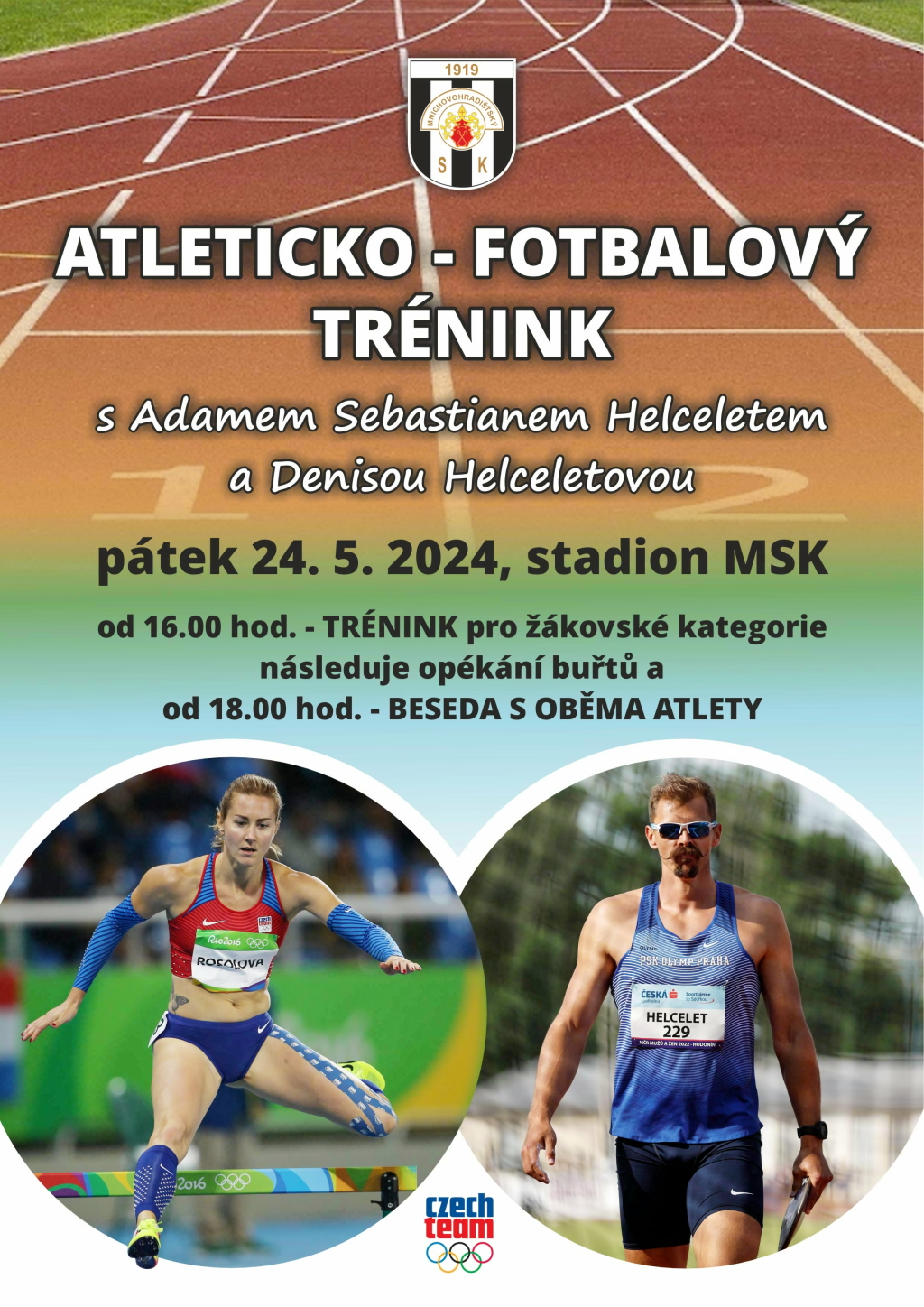 Atleticko-fotbalový trénink se uskuteční v pátek 24. května od 16 hodin na stadionu Mnichovohradišťského sportovního klubu. Po sportovním bloku bude následovat společné opékání buřtů a v 18 hodin beseda s Adamem Sebastianem Helceletem a Denisou Helceletovou.