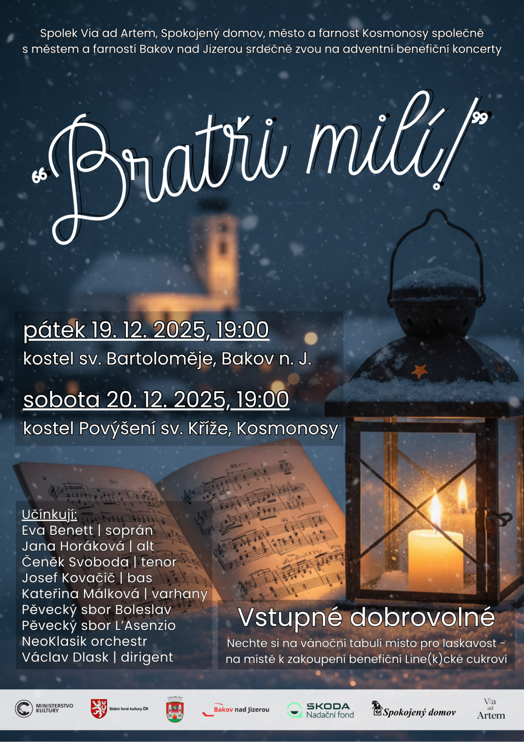Spolek Via ad Artem, Spokojený domov, město a farnost Kosmonosy společně s farností Bakov nad Jizerou vás srdečně zve na adventní koncerty Bratři Milí!
