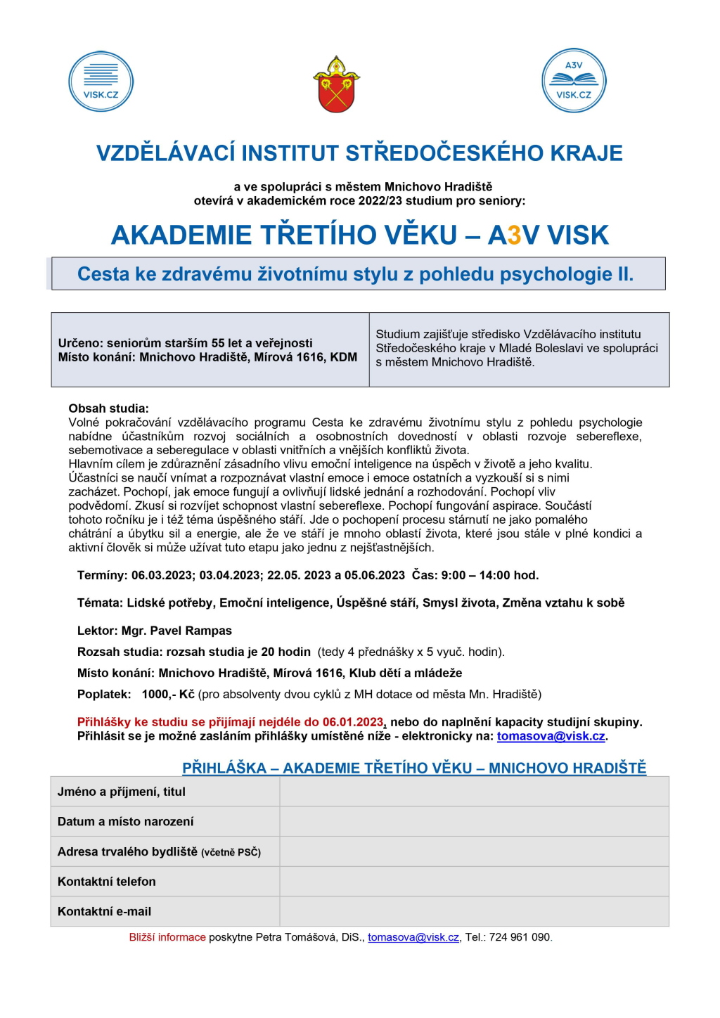 Vzdělávací institut Středočeského kraje zve seniory z Mnichova Hradiště a okolí na pokračování dvousemestrálního vzdělávacího programu Cesta ke zdravému životnímu stylu z pohledu psychologie. První přednáška druhé části tohoto programu se uskuteční v březnu. Hlásit se k účasti je možné do 6. ledna.