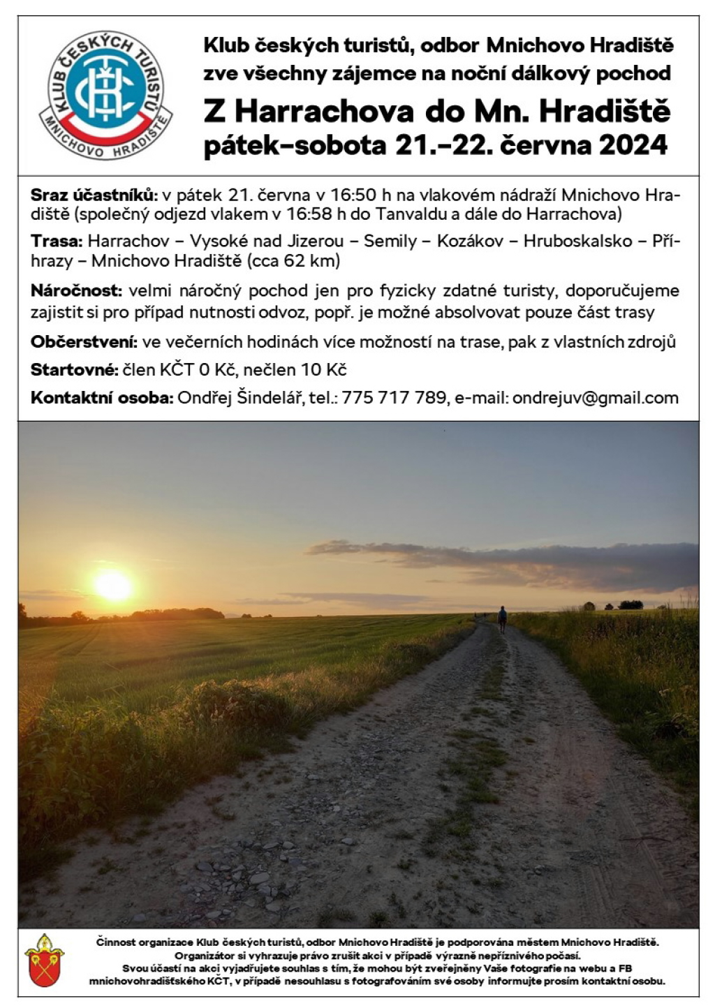 V pátek a sobotu 21.–22. června je připraven výlet pro opravdové fajnšmekry a zdatné turisty! Noční cesta z Harrachova do Mnichova Hradiště pro milovníky zajímavých výzev! Čeká nás cca 62 km nocí, za svitu měsíce. Letos jde již o 4. ročník a opravdu je reálné to zvládnout! Za sebou máme již noční cesty z Jičína, z Žitavy a loni pak z Mělníka. Ta radost ze zdárného absolvování trasy je nepopsatelná! Stojí to za to! Sraz v pátek v 16.50 hodin na vlakovém nádraží v Mnichově Hradišti.