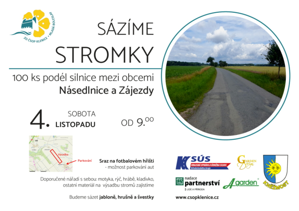 ČSOP Klenice pořádá další akci. Tentokrát budou dobrovolníci sázet 100 ovocných stromků podél silnice mezi obcemi Násedlnice a Zájezdy.