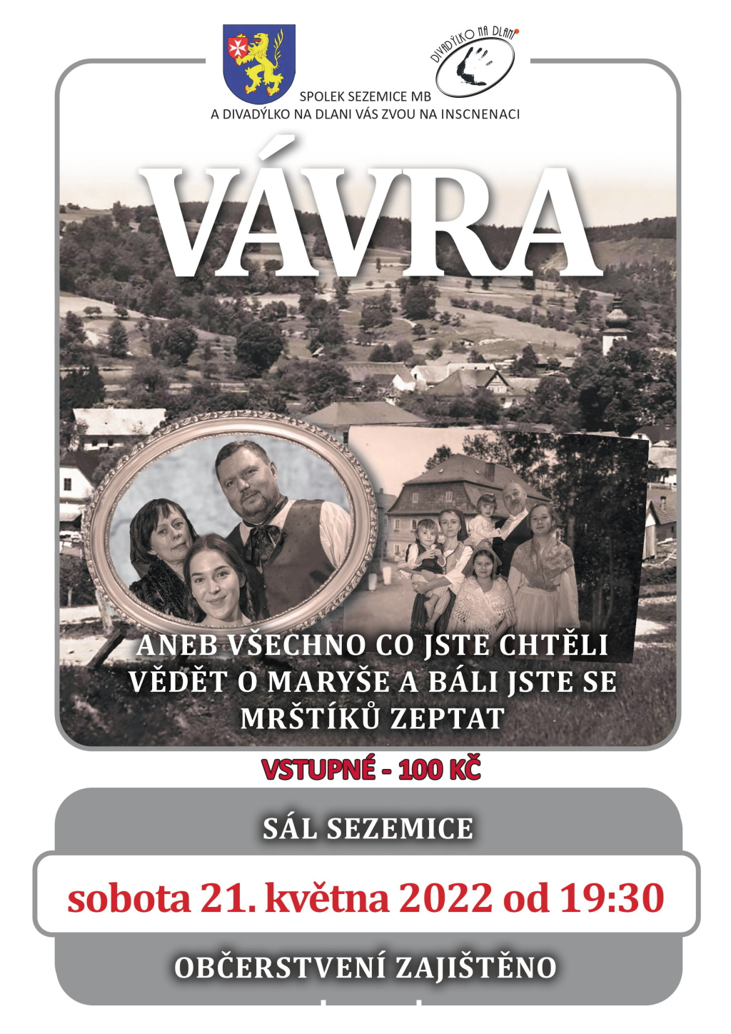 Po pauze způsobené pandemií se do Sezemic opět vrací divadelní představení. Tentokrát se na místním sále v sobotu 21. května 2022 od 19.30 představí Divadýlko na dlani z Mladé Boleslavi s veselohrou Vávra aneb všechno, co jste chtěli vědět o Maryše a báli jste se Mrštíků zeptat.