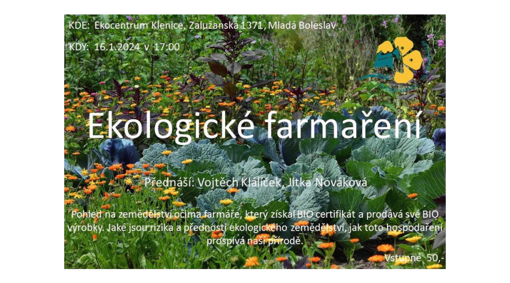 Ekocentrum Klenice (Zalužanská 1371, Mladá Boleslav) pořádá v úterý 16. ledna od 17 hodin přednášku o ekologickém farmaření. Lektory budou Jitka Nováková a Vojtěch Králíček.