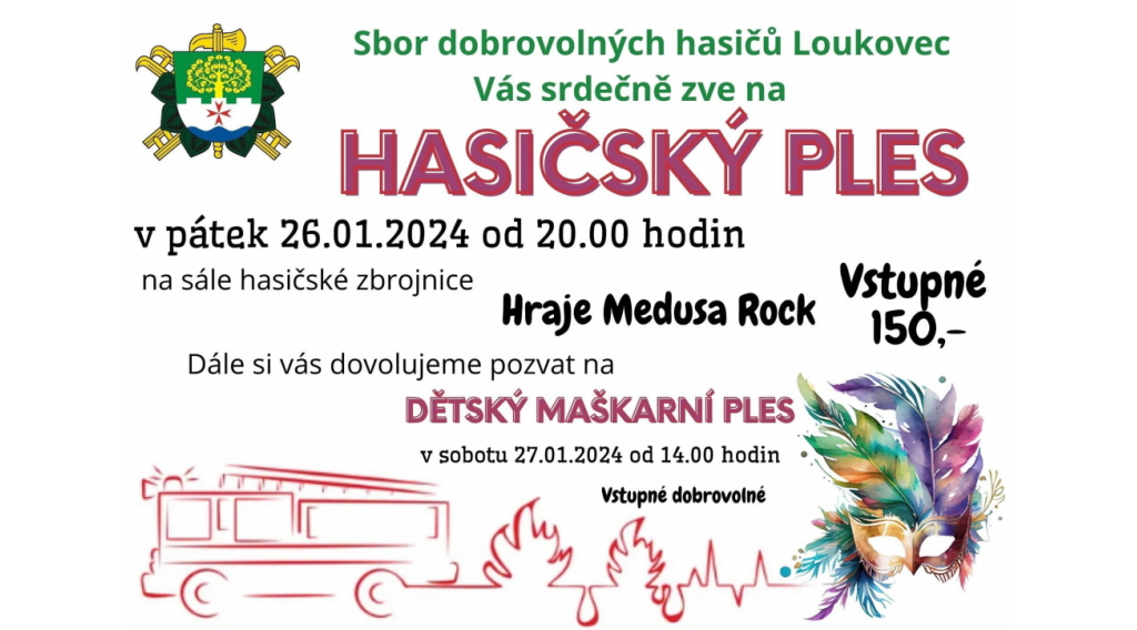 Sbor dobrovolných hasičů Loukovec srdečně zve na hasičský ples, který se uskuteční v pátek 26. ledna od 20 hodin na sále hasičské zbrojnice. Hrát bude Medusa Rock. Vstupné je 150 korun.