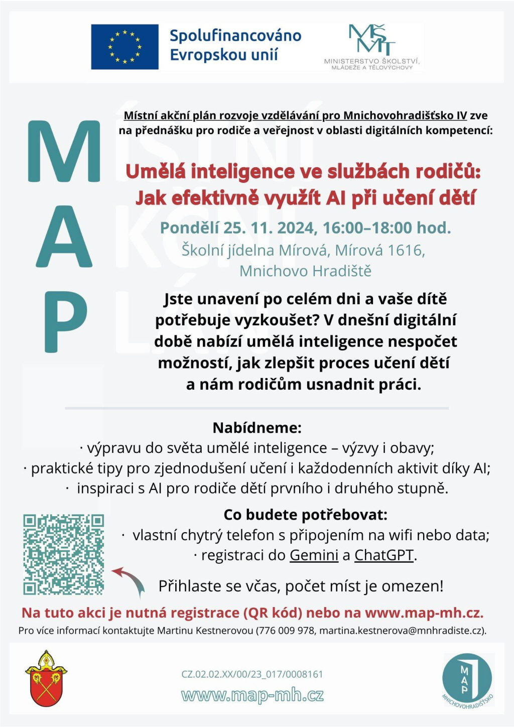 MAP Mnichovohradišťsko zve na přednášku pro rodiče a veřejnost s názvem Umělá inteligence ve službách rodičů: Jak efektivně využít AI při učení dětí. Uskuteční se v pondělí 25. listopadu od 16 do 18 hodin ve školní jídelně Mírová, Mírová 1616, Mnichovo Hradiště.