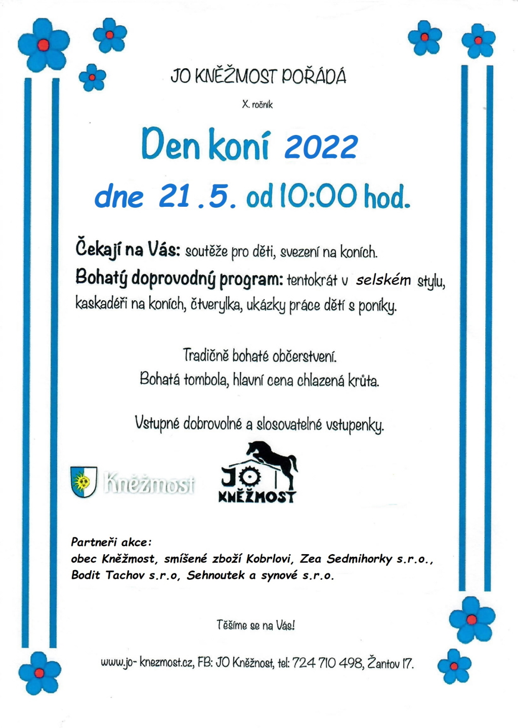 Jezdecký oddíl Kněžmost zve po dvouleté odmlce na tradiční květnový den koní, který je naplánovaný na 21. května 2022 od 10 hodin v areálu oddílu v Loučném mlýně na Žantově.