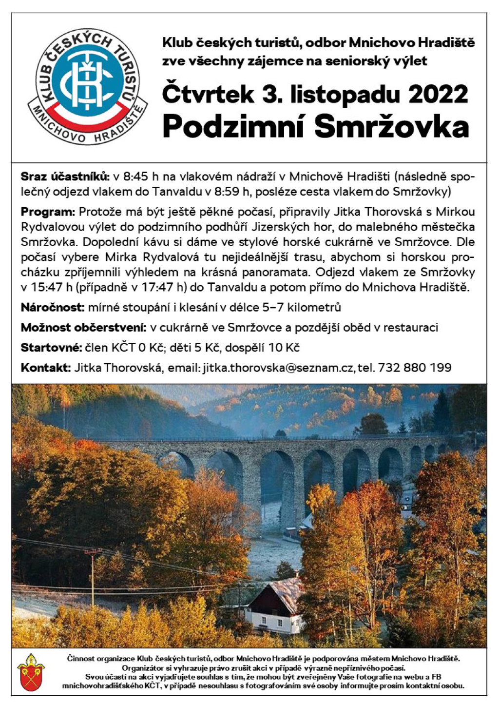 Protože je k nám podzim zatím spíše vlídnější, připravily pro vás Jitka Thorovská a Miroslava Rydvalová na čtvrtek 3. listopadu 2022 seniorský rychlovýlet do podzimní Smržovky. Nechte se pohltit krásou barevných Jizerských hor a přidejte se ke společnému výjezdu do Smržovky a výšlapu po jejím okolí. Všechny potřebné informace naleznete v přiloženém letáčku.