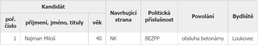 Samostatný nezávislý kandidát Miloš Najman, který kandiduje proti výše zmíněným uskupením. Zdroj: volby.czSamostatný nezávislý kandidát Miloš Najman, který kandiduje proti výše zmíněným uskupením. Zdroj: volby.cz