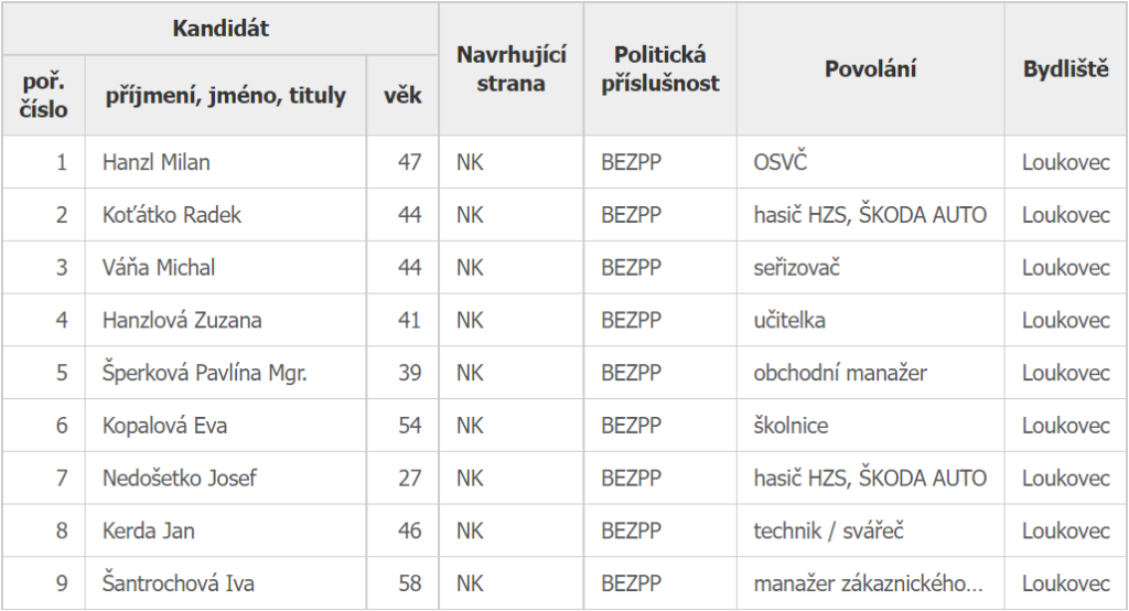 Kandidáti ve volbách v roce 2022 v Loukovci za uskupení SNK obce Loukovec. Zdroj: volby.cz