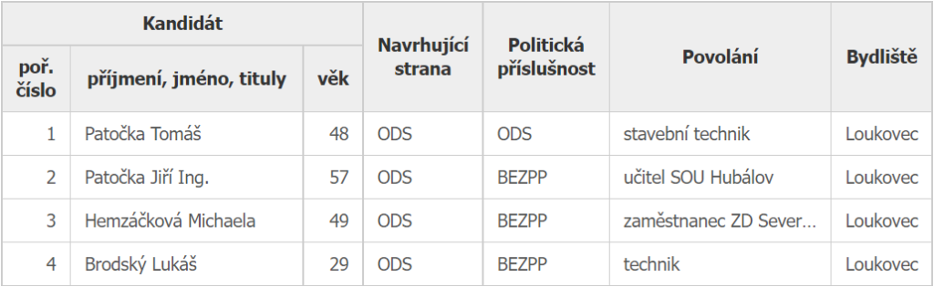 Další z mála obcí na Mnichovohradišťsku, kde má mezi kandidáty zastoupení tradiční politická strana, je Loukovec. V uskupení Žijeme pro Loukovec – sdružení nezávislých kandidátů a ODS jsou čtyři kandidáti, z toho jeden přímo člen ODS, a sice bývalý starosta Tomáš Patočka.