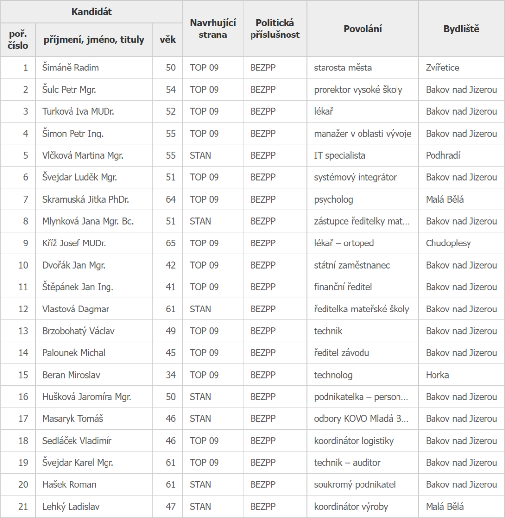 Kandidáti ve volbách v roce 2022 v Bakově nad Jizerou za uskupení Koalice TOP 09 a STAN – lidé, které znáte. Zdroj: volby.cz
