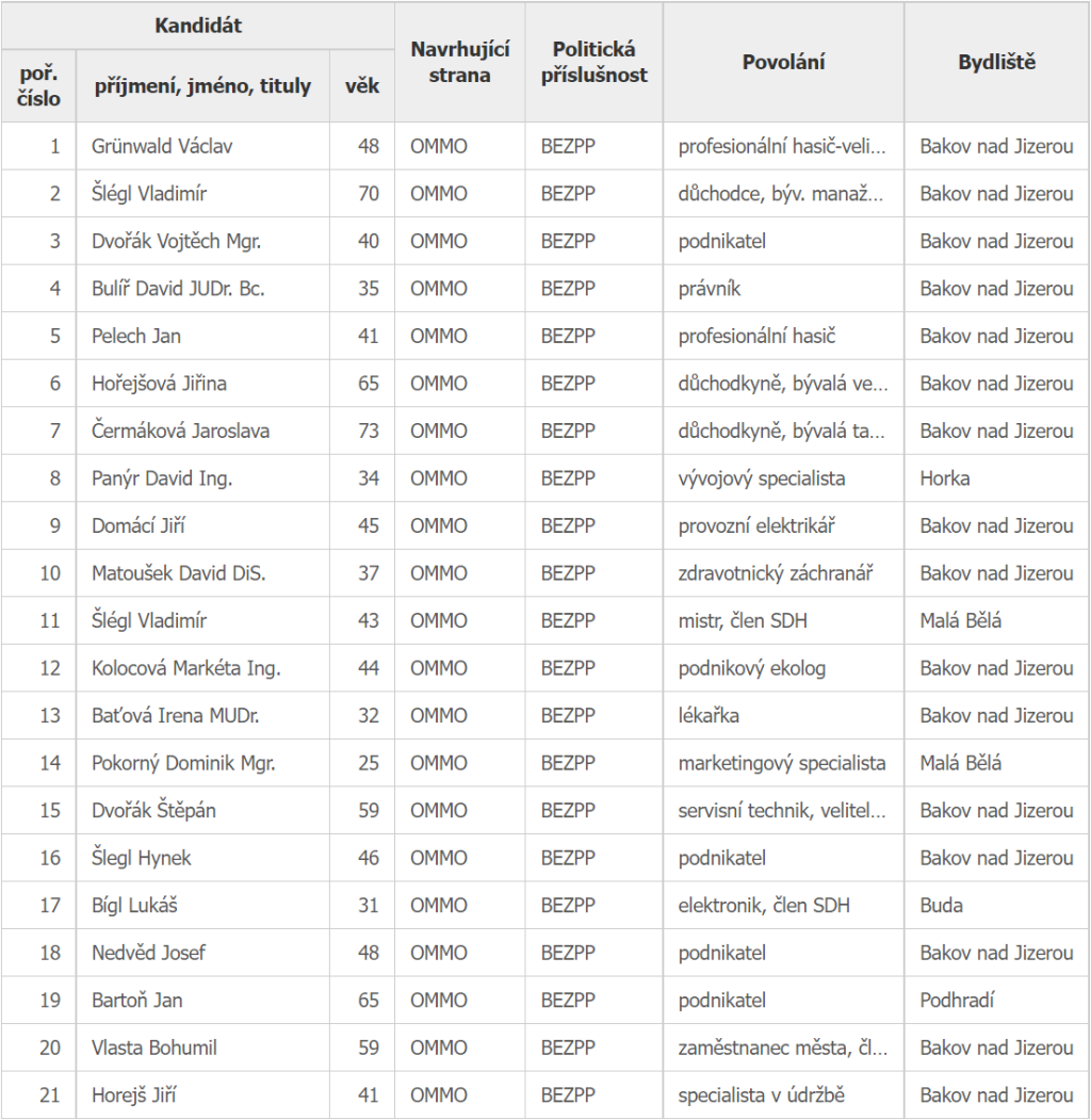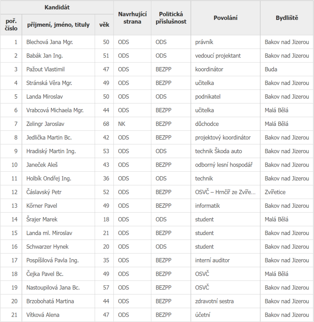 Kandidáti ve volbách v roce 2022 v Bakově nad Jizerou za uskupení ODS a nezávislí pro Bakov a jeho místní části. Zdroj: volby.cz