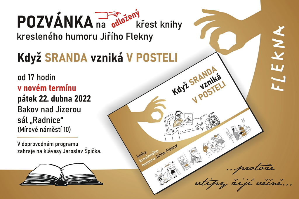 Odložený křest knihy kresleného humoru vozíčkáře Jiřího Flekny Když sranda vzniká v posteli se uskuteční v pátek 22. dubna 2022 od 17 hodin v Bakově nad Jizerou v sále na „Radnici“.