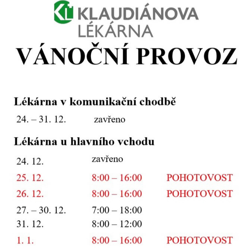 Lékárny Klaudiánovy nemocnice v Mladé Boleslavi mají na konci roku tradičně pozměněnou provozní dobu. Zajištěna je však pohotovost ve svátky, kdy zavírají běžné lékárny.