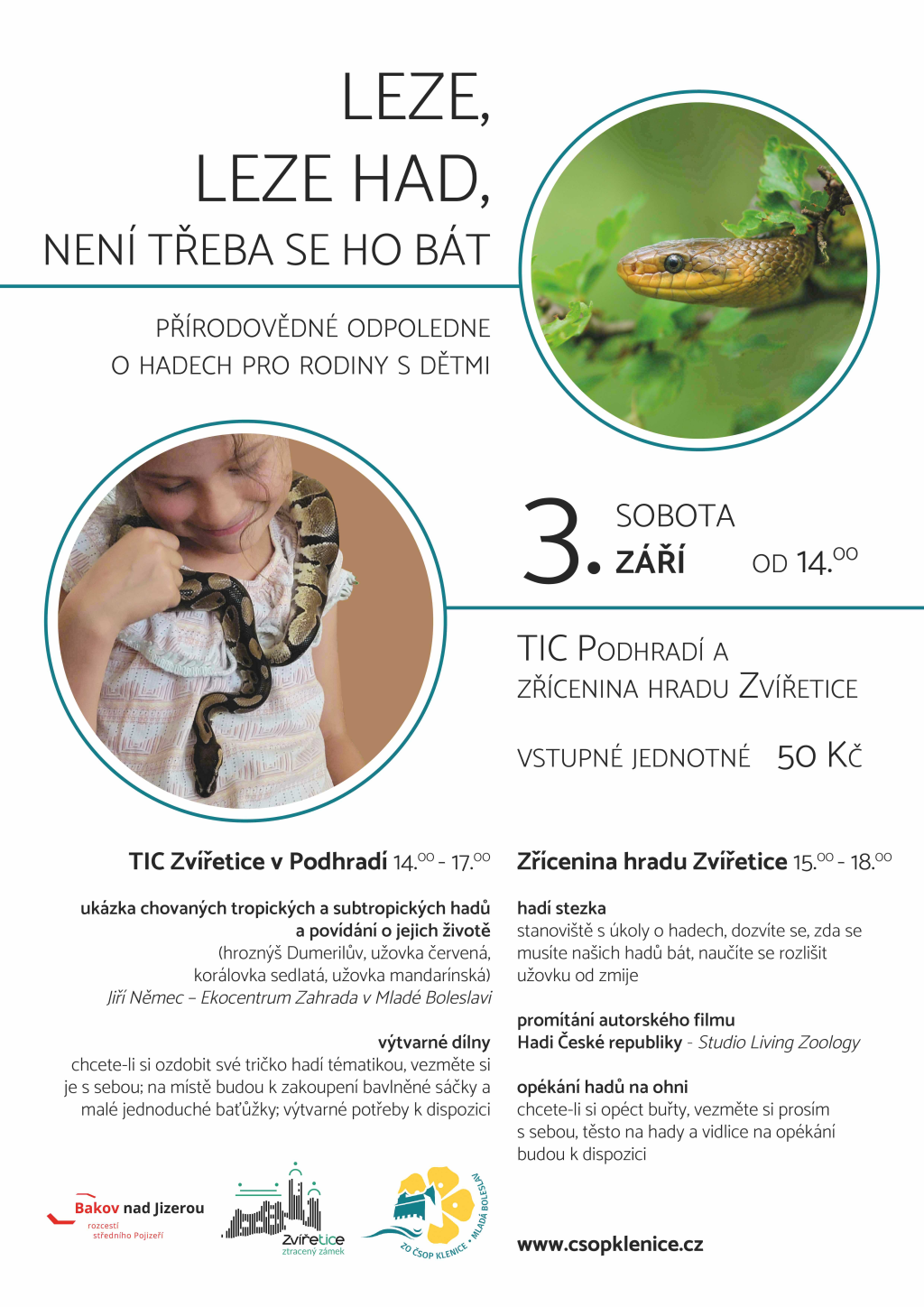 Český svaz ochránců přírody (ČSOP) Klenice zve rodiče s dětmi na přírodovědné odpoledne o hadech. Uskuteční se v sobotu 3. září 2022 od 14.00 v TIC Zvířetice v Podhradí a na zřícenině zámku Zvířetice.