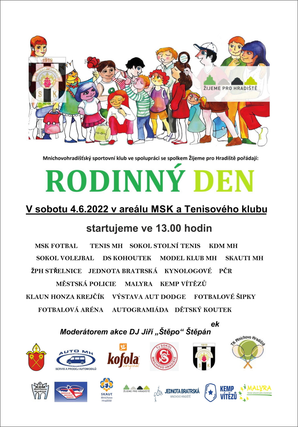 Mnichovohradišťský sportovní klub a spolek Žijeme pro Hradiště zvou po dvouleté pauze na Rodinný den v areálu MSK a tenisového klubu v sobotu 4. června 2022 od 13 hodin.
