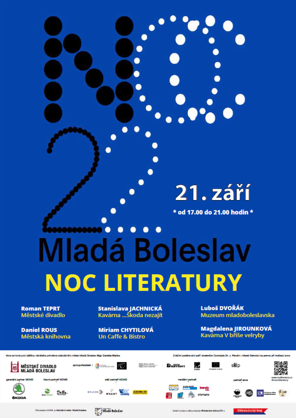 I v letošním roce budou s koordinací akce pomáhat dobrovolníci z řad studentů Gymnázia Dr. Josefa Pekaře, kterým opět náleží velké poděkování. Mladoboleslavská Noc literatury se koná pod záštitou náměstka primátora Mladé Boleslavi Daniela Marka.