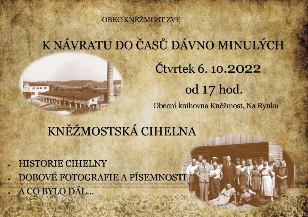 Ve čtvrtek 6. října 2022 od 17 hodin vás v obecní knihovně Kněžmost čeká vyprávění o historii cihelny a možnost prohlédnout si dobové fotografie a písemnosti.