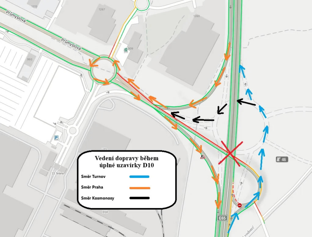 Provoz na dálnici D10 bude částečně omezen v sobotu 23. listopadu od 12 do 17 hodin a v neděli 24. listopadu od 11 do 14 hodin, veden v této době bude místem prací v režimu 1 + 1, tedy jedním jízdním pruhem v každém směru. Úplná uzavírka dálnice v délce zhruba 300 metrů, v místě demolice, je plánována v sobotu od 17 hodin do neděle 11 hodin. V této době bude provoz veden v režimu 1 + 1 po nájezdových a sjezdových rampách mimoúrovňové křižovatky Kosmonosy, přičemž vozidla jedoucí ve směru od Turnova na Prahu budou zajíždět na přilehlou okružní křižovatku v Průmyslové ulici v Kosmonosech u 13. brány areálu automobilky Škoda Auto a vozidla směřující od Prahy na Turnov nebo do Kosmonos již budou využívat část nově budované turbookružní křižovatky.