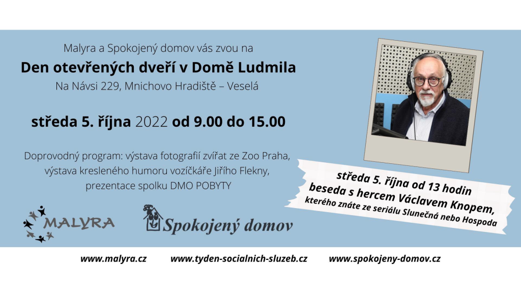 Malyra spolu se Spokojeným domovem pořádají ve středu 5. října 2022 od 13 hodin v Domě Ludmila (Na Návsi 229, Veselá) besedu s hercem a dabérem Václavem Knopem.