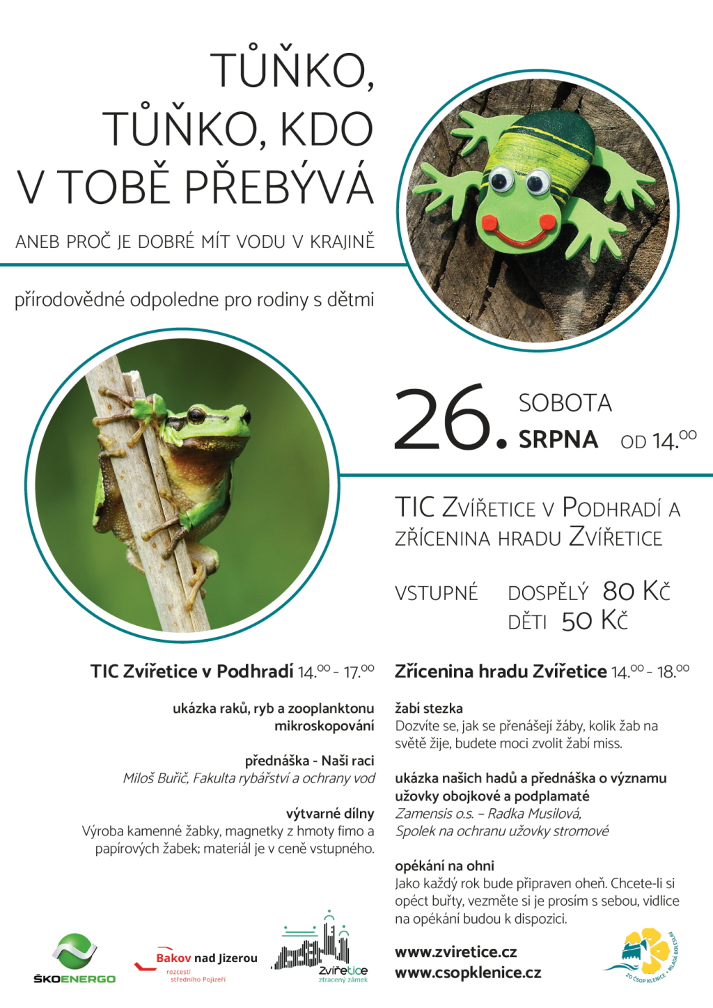 Máte rádi ryby, raky, žáby a vše, co se vyskytuje u vody? Pak vás ČSOP Klenice srdečně zve sobotu 26. srpna od 14 hodin na zříceninu Zvířetice a do areálu infocentra. A to již na šesté přírodovědné odpoledne pro velké i malé.