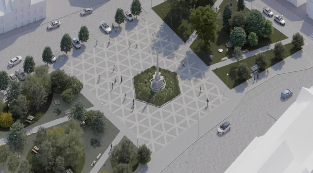 Jedno křídlo náměstí zůstane zatravněné, druhé bude kombinovat trávník s rozvolněnou dlažbou, která umožní vsakování vody a širší využití prostoru.