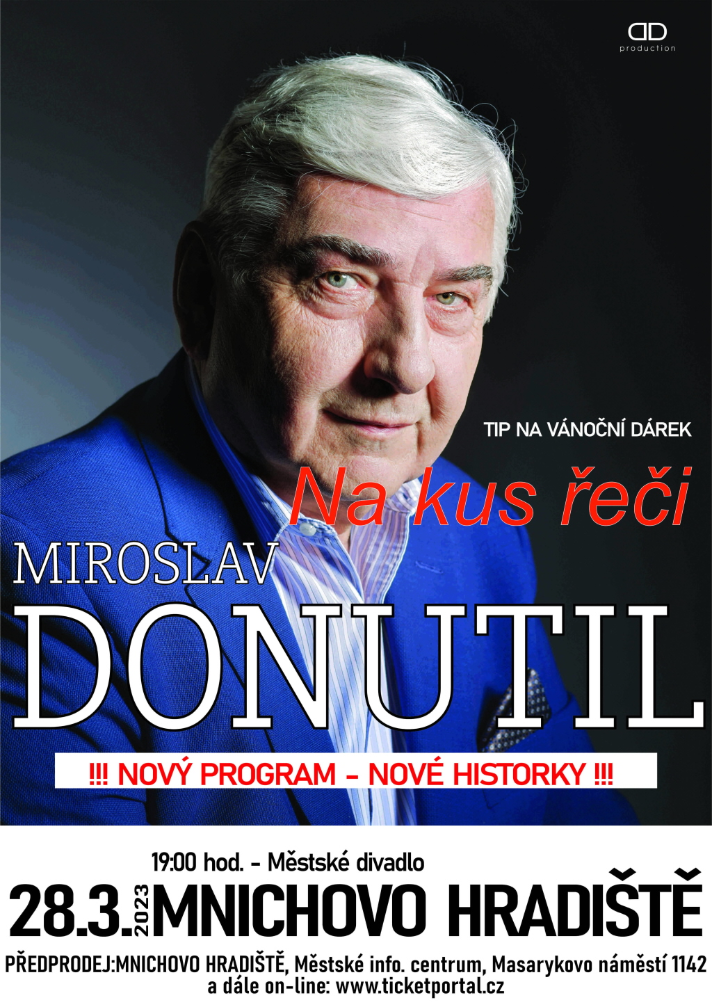 Pro všechny, kteří milují dobrý český humor, se v březnu chystá v mnichovohradišťském divadle opravdová lahůdka! Zavítá tam populární český bavič a herec Miroslav Donutil. Přijede představit jednu ze svých one man show, které mají vždy velký úspěch. Tentokrát to bude nejoblíbenější pořad Na kus řeči.