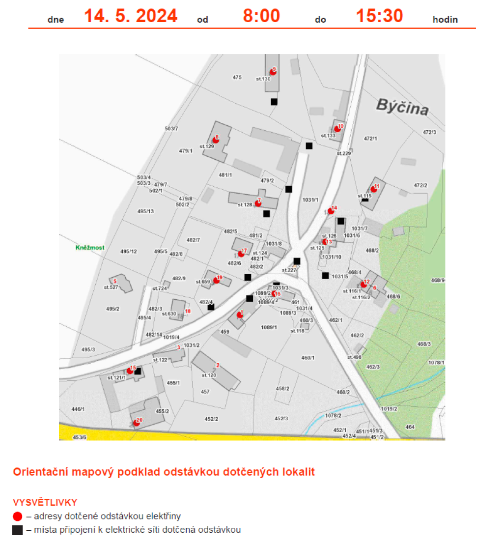 Společnost ČEZ distribuce oznámila odstávku elektřiny v místní části Kněžmostu Býčina.
