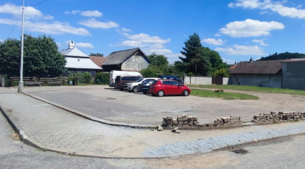 Jako provizorní parkování můžete využít prostor zelené plochy vedle lékárny na náměstí – u panelové cesty.