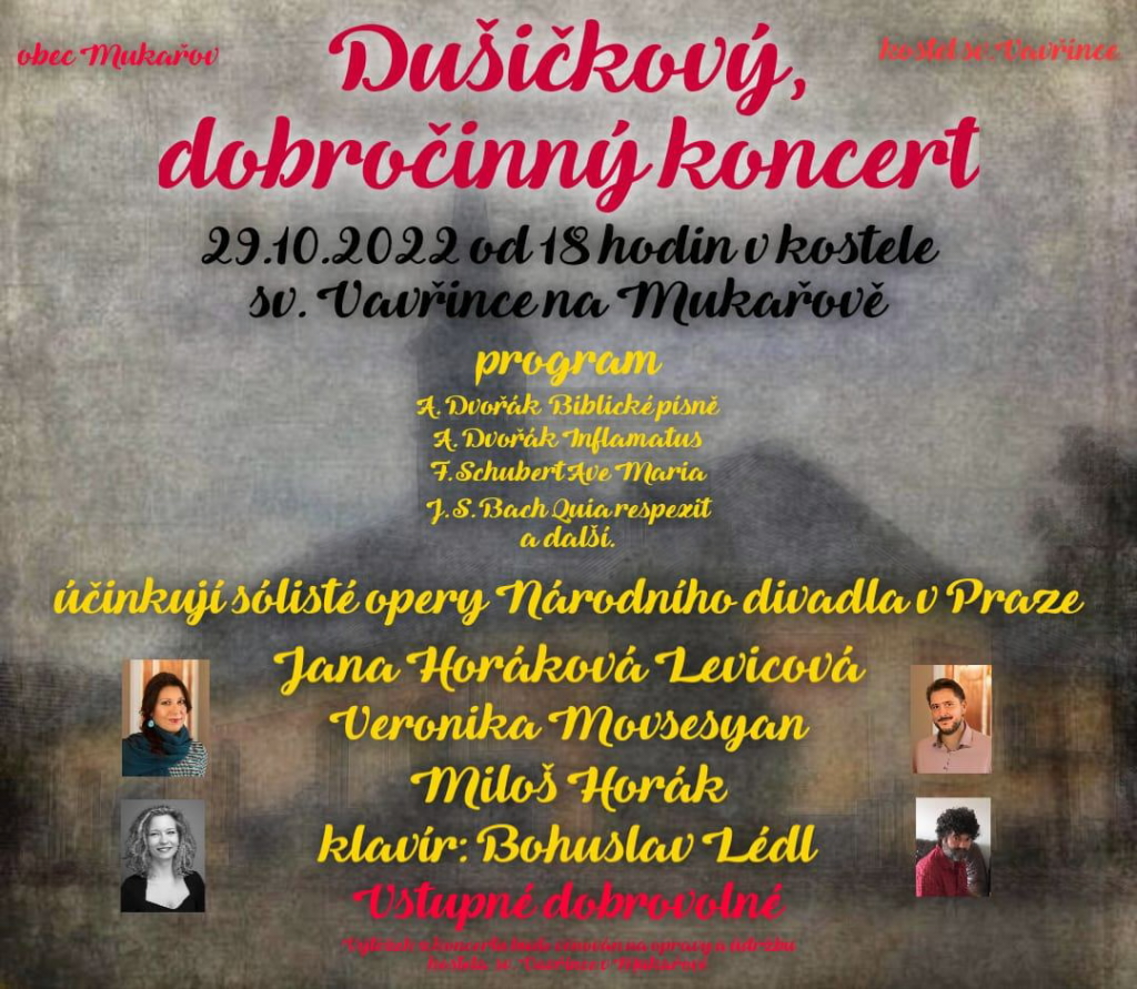 V sobotu 29. října 2022 se od 18 hodin koná v kostele sv. Vavřince v Mukařově dušičkový dobročinný koncert.