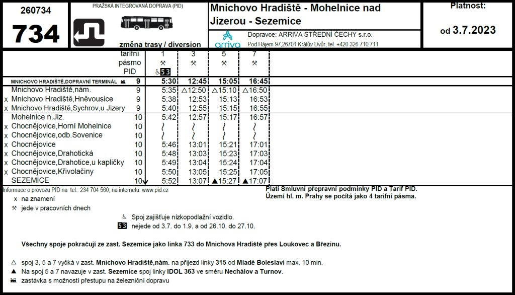 Objížďkový jízdní řád linky 734 platný po dobu uzavírky