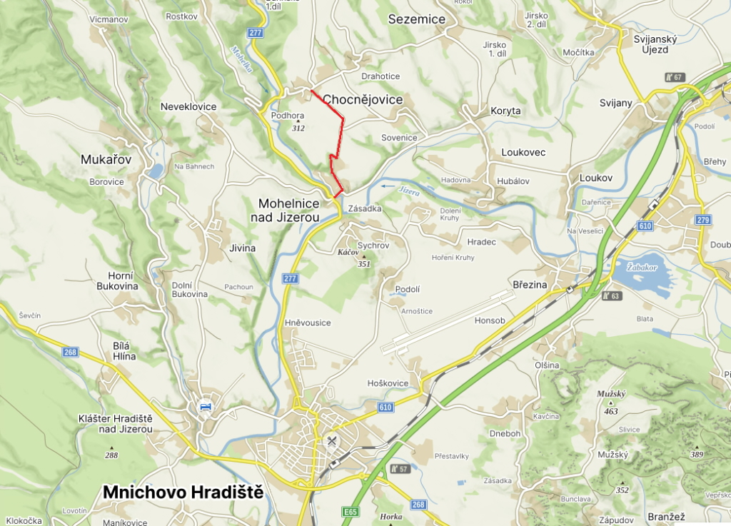 Mapka s červeně vyznačeným úsekem dotčené silnice. Zdroj podkladu: mapy.cz