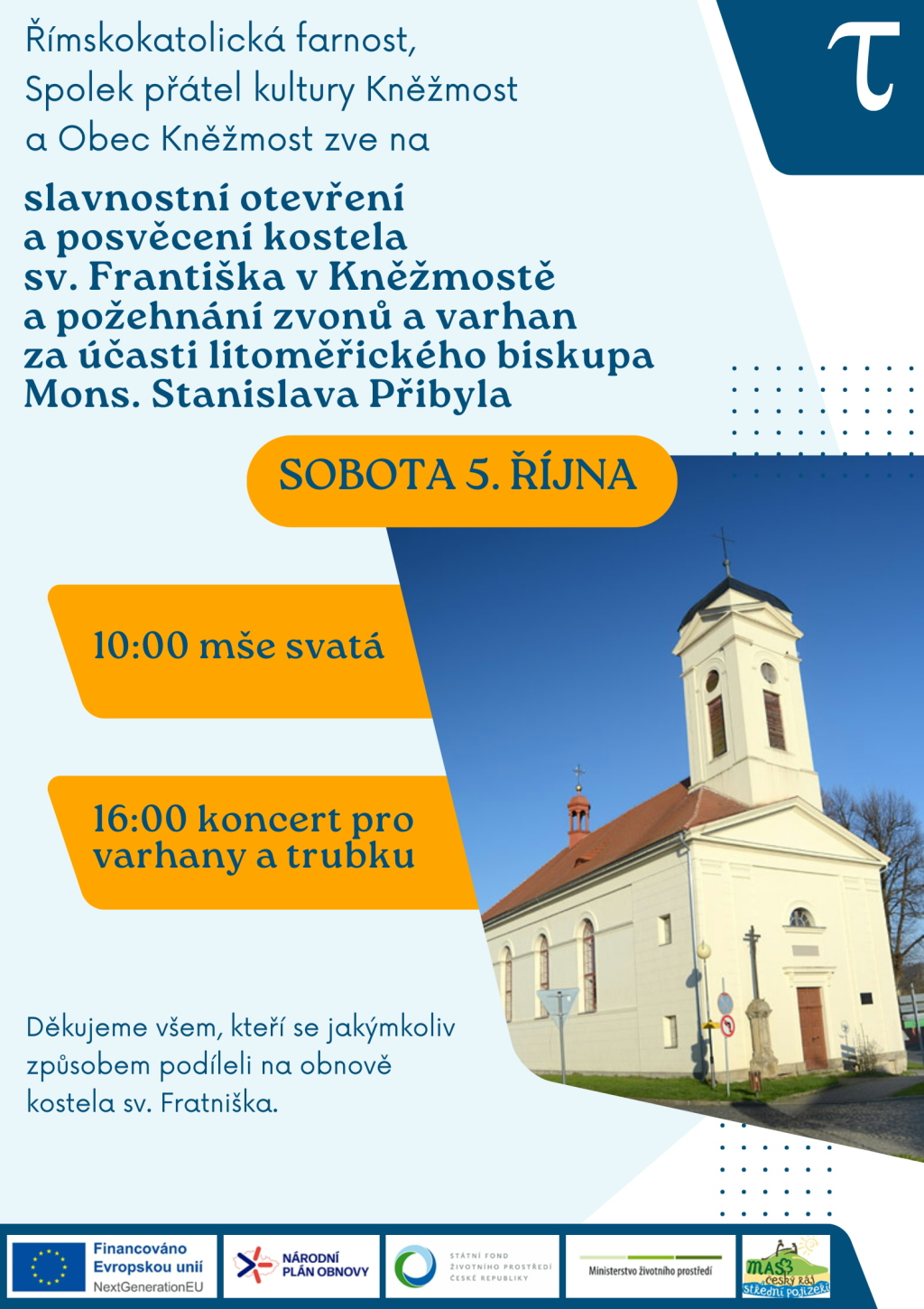 Římskokatolická farnost, Spolek přátel kultury a obec Kněžmost srdečně zvou všechny příznivce historie a kultury na slavnostní otevření kostela sv. Františka Serafínského, které se uskuteční v sobotu 5. října.
