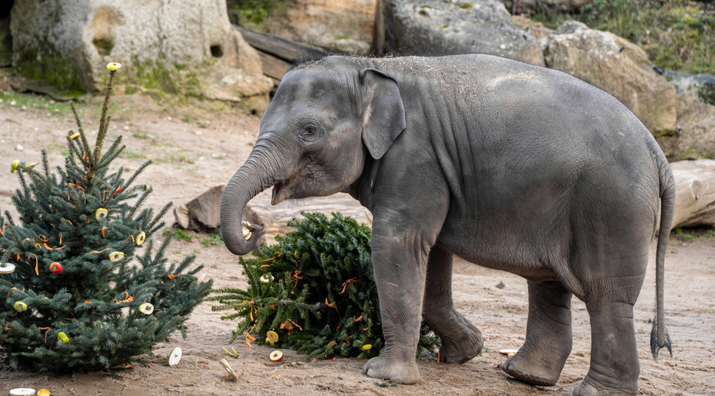 Neprodané vánoční stromky potěší zvířata mezi 27. a 29. prosincem. Sloni je dostanou po všechny tři dny, vždy v 13.15. Sledovat, jak si s nimi poradí, budou moci návštěvníci z vyhlídky poblíž výběhu vlků. Na snímku nejmladší členka stáda, tříletá slonice Lakuna. Foto: Oliver Le Que, Zoo Praha