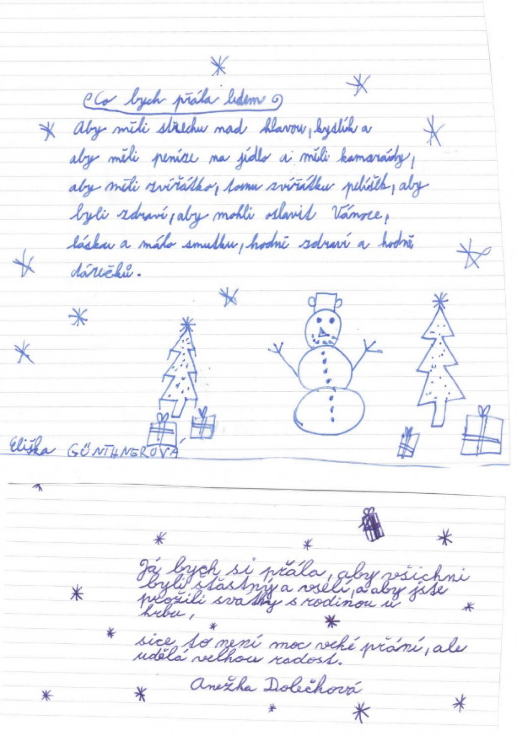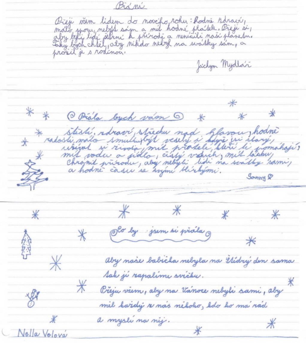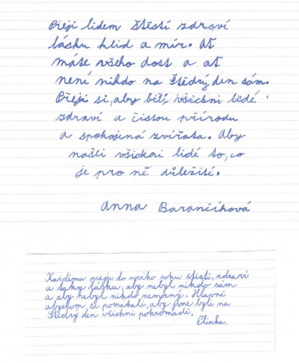 Na vlastnoručně napsaných dětských vánočních vzkazech se opakují přání, aby byli lidé šetrní k přírodě a aby nebyl nikdo sám, abychom si pomáhali a aby nebyl nikdo nemocný. Děkujeme za krásná přáníčka a níže se s nimi dělíme s našimi čtenáři.