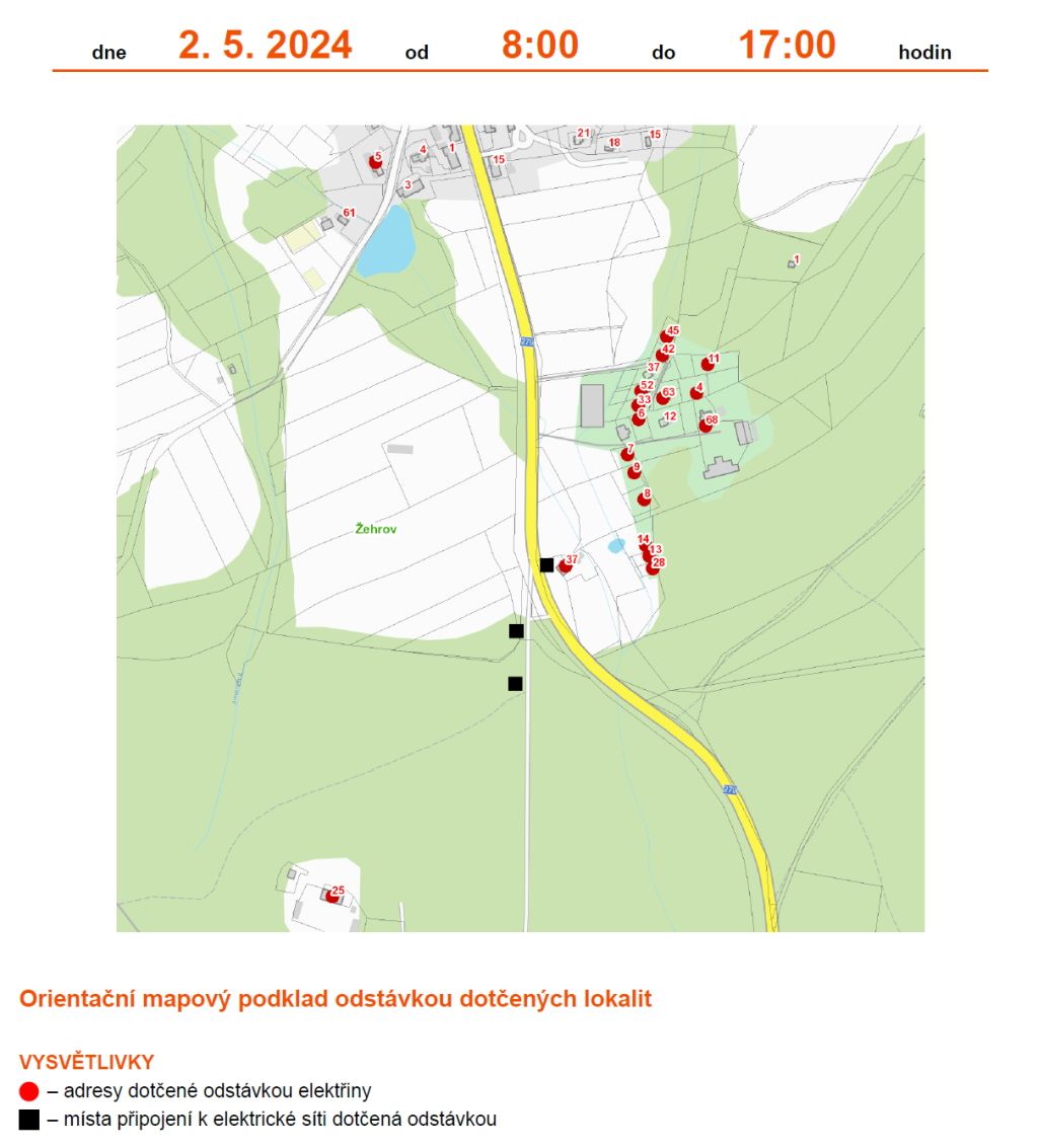 Společnost ČEZ distribuce oznámila odstávku elektřiny v místní části Žehrov.