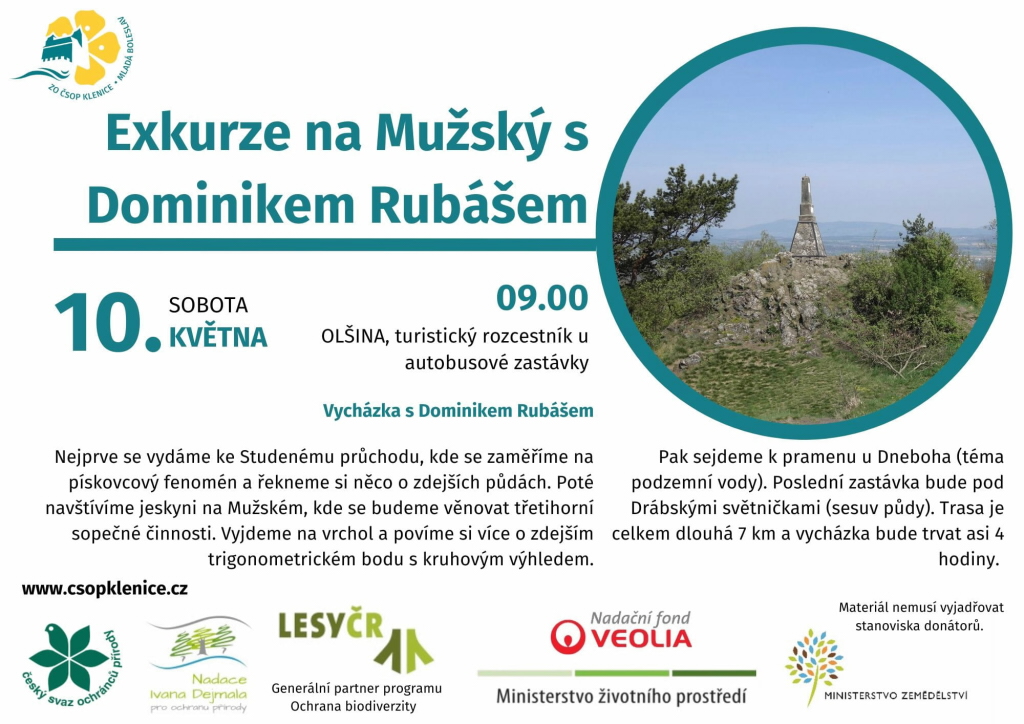 Trasa začne u Studeného průchodu, kde se účastníci seznámí s tímto pískovcovým fenoménem a dozvědí se něco o zdejších geologických zvláštnostech. Poté se výprava vydá na Mužský, kde budou účastníci exkurze seznámeni s třetihorními jeskyněmi a tématem sopečné činnosti. Na samotném vrcholu Dominik Rubáš zájemce blíže seznámí s trigonometrickým bodem s kruhovým výhledem.