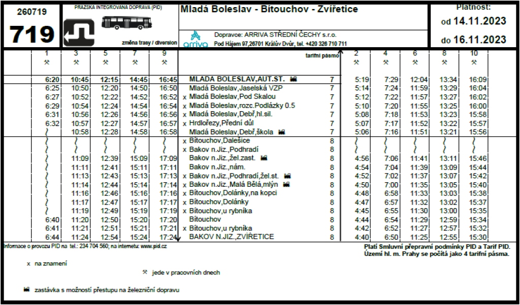 Z provozních důvodu je spoj s odjezdem v 6.20 z Mladé Boleslavi veden z Hrdlořez přímo do Bítouchova a Zvířetic kolem Čisté mimo Podhradí i Dolánky.