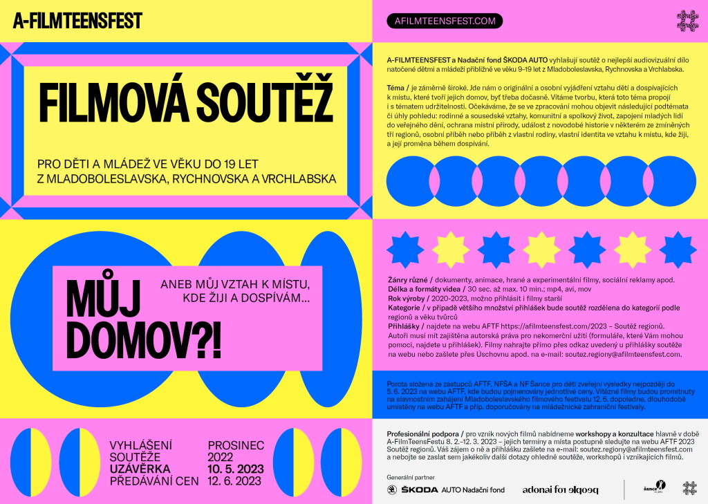 Jedinečnou příležitost projevit své talenty získají v příštím roce děti a teenageři ve věku od 9 do 19 let z Mladoboleslavska, Rychnovska a Vrchlabska, které zajímá film a věnují se vlastní tvorbě. A-FilmTeensFest (AFTF), mezinárodní festivalová přehlídka audiovizuálních děl dětí a mládeže, a Nadační fond Škoda Auto pořádají filmovou soutěž s názvem Můj domov?! aneb můj vztah k místu, kde žiji a dospívám. V soutěži, která má uzávěrku 10. května 2023, jde především o osobní vyjádření vztahu mladých lidí k místu, které tvoří jejich domov. Součástí budou také filmové workshopy a konzultace, z nichž první se uskuteční už 14. ledna 2023 v Mladé Boleslavi. Účastnit se mohou jednotlivci, skupiny i školy.
