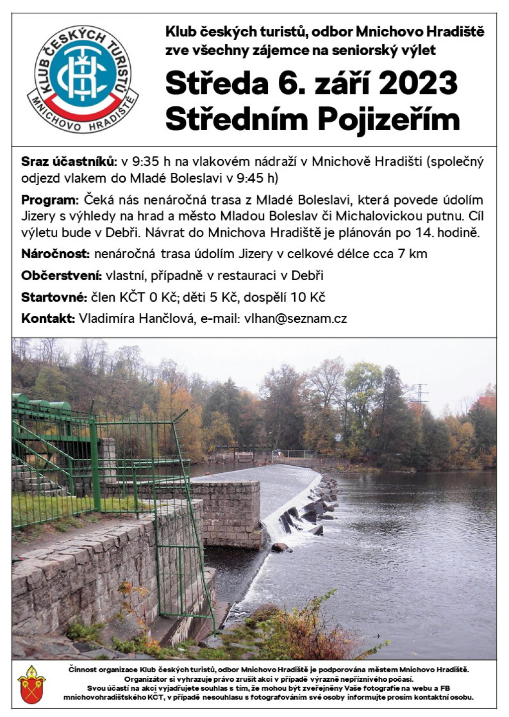 První zářijový výlet čeká turisty již ve středu 6. září, kdy se s Vladimírou Hančlovou vydají na nenáročnou vycházku z Mladé Boleslavi do Debře podél toku řeky Jizery