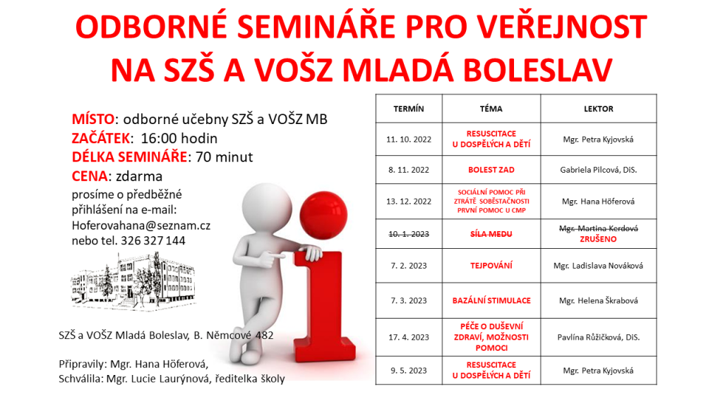 Střední zdravotnická škola a Vyšší odborná škola zdravotnická v Mladé Boleslavi zve širokou veřejnost na odborné semináře, které se konají během školního roku jednou za měsíc vždy od 16 hodin. Semináře jsou zdarma.