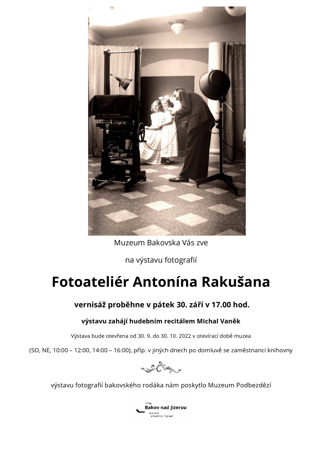 Muzeum Bakovska zve na vernisáž výstavy fotografií zdejšího rodáka Antonína Rakušana. Seznámíte se zde nejen s jeho fotografickou tvorbou, ale dozvíte se více o životě tohoto velmi všestranného člověka. Budete si moci prohlédnout, jaké náčiní se v době před sto lety ke zhotovení fotografií používalo.